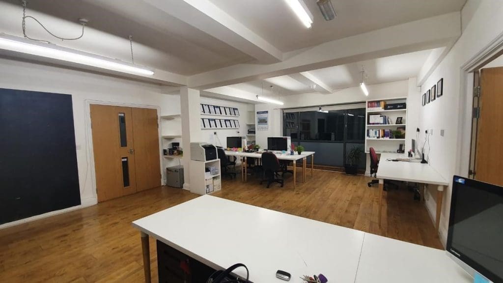 Modern office suites – comprising two 1st floor office suites with 24 hour access and passenger lift. The suites comes with a variety of office furniture and there is also a 50’ wall mounted plasma TV in the boardroom.